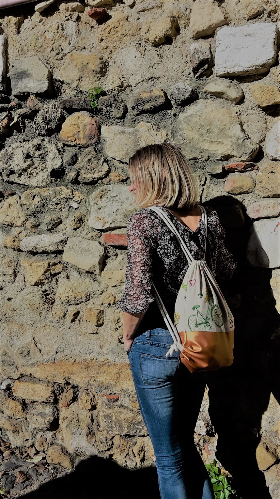 Turnbeutel aus robusten Baumwoll-Canvasstoff mit tollen großen Frühlingsmotiven kombiniert mit kupferfarbenem Kunstleder.